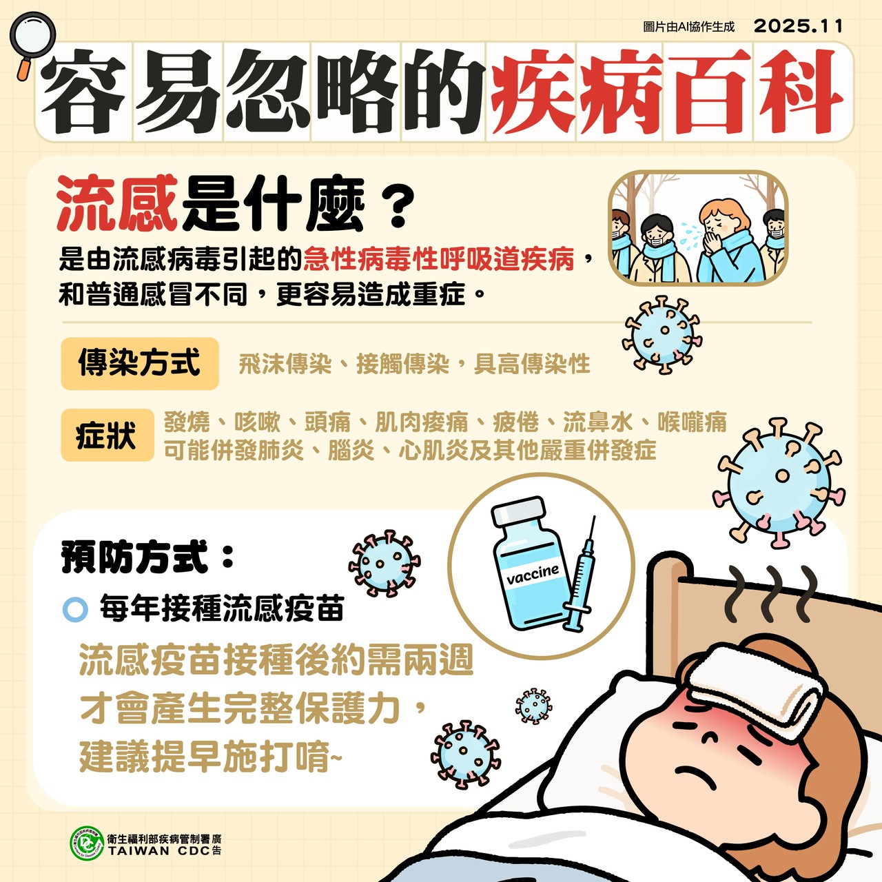 ❤️流感是什麼? — 《容易忽略的疾病百科Vol.5》📖 流感和普通感冒不同,症狀通常比一般感冒嚴重,也更容易造成嚴重併發症 🤒 提醒民眾!! 除了落實勤洗手、呼吸道禮節等衛生好習慣以外,預防流感最有效的方式就是接種疫苗 疫苗接種後約需2週才會產生完整保護力 符合公費資格者記得儘快施打唷~