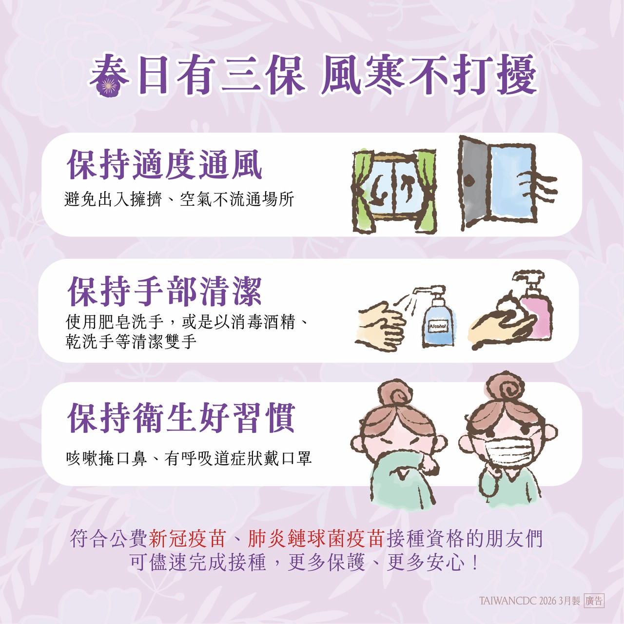 🌦️春天氣候變化多端,可能前一天還汗流浹背,第二天卻得穿上外套 😷除了注意保暖外,也要落實衛生好習慣, 尤其長者、幼兒或是有慢性病的朋友,應特別留意身體變化,也可以透過接種疫苗保護自己!