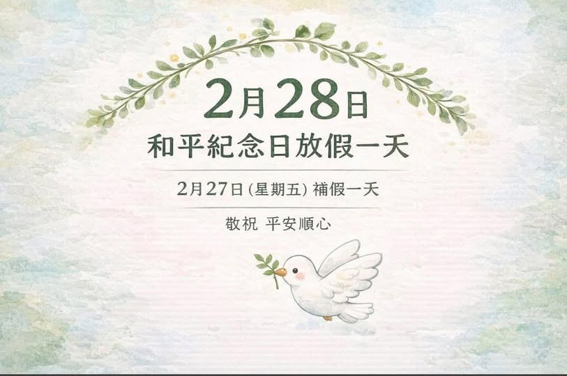2/27(五)–3/1(日)為228和平紀念日連續假期