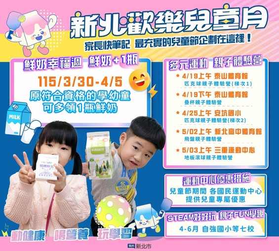 3/30(一)~4/5(日)期間,符合資格的孩子除了原本每週1瓶,再加碼1瓶(當週可領2瓶),讓孩子營養滿滿、開心過節