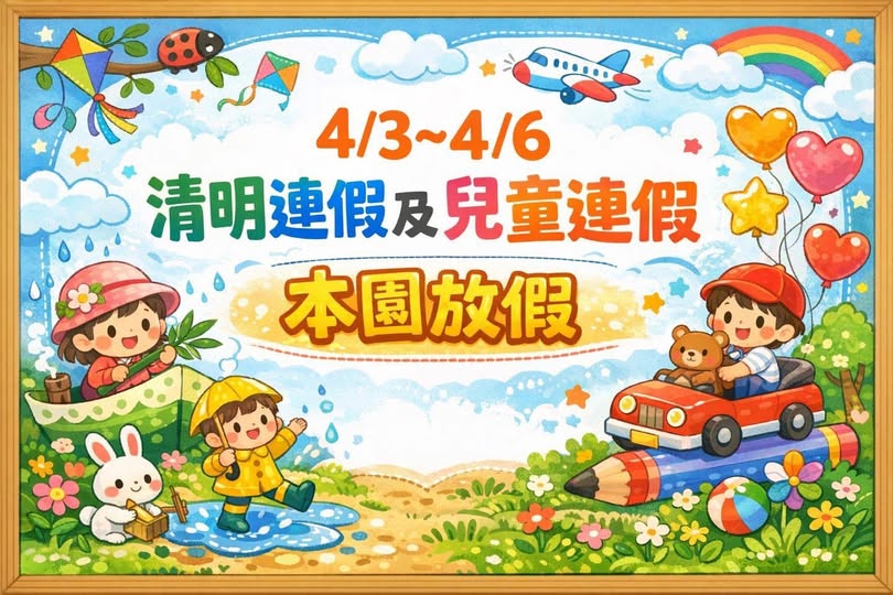 依政府公告之國定假日安排,本園清明及兒童節連續假期放假日期如下: